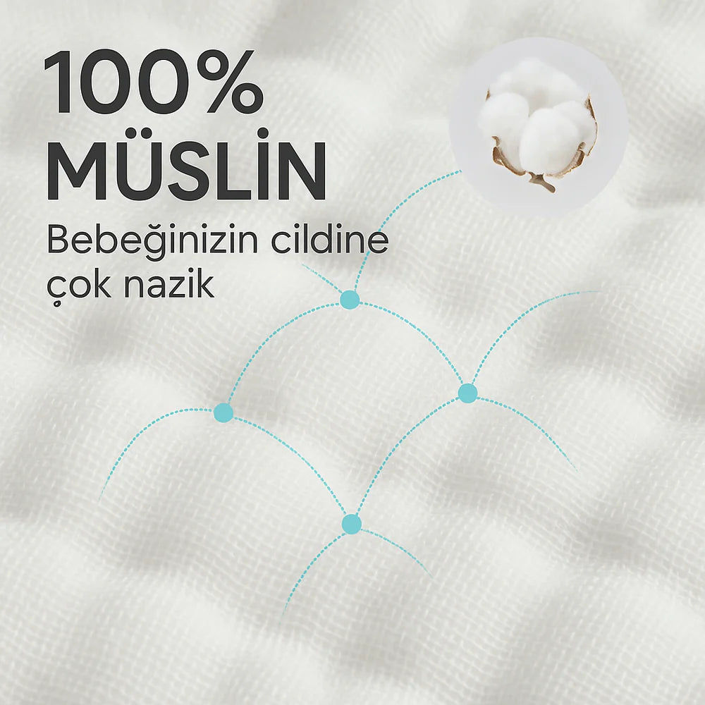 %100 pamuk ve müslin kumaş sayesinde bebeğinizin hassas cildi rahat nefes alır, terlemez, tahriş olmaz.