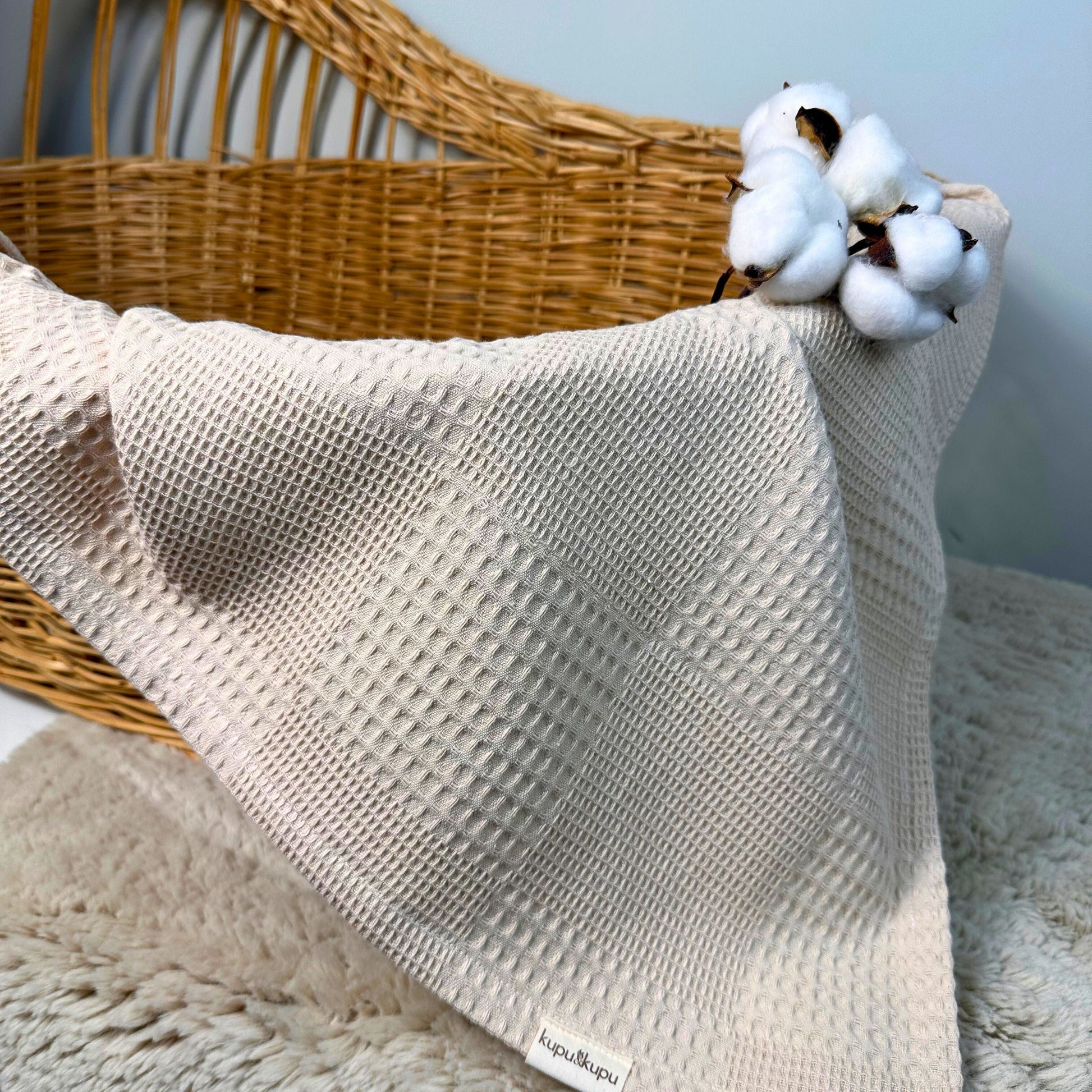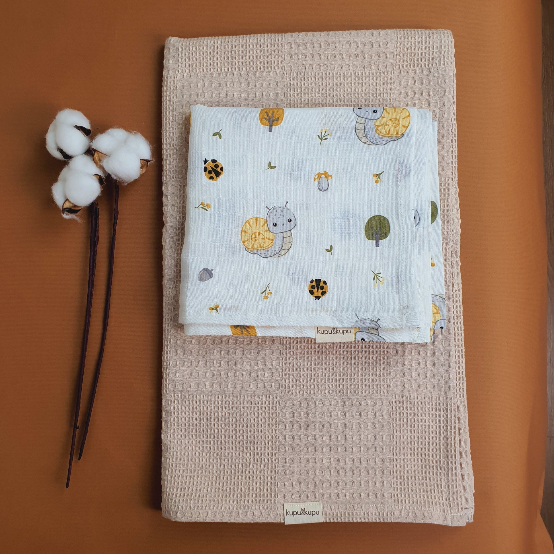 🧵 Farklı Dokular, Tek Set: Waffle dokulu pamuklu pike ile sıcak tutan, nefes alan bir örtü – müslin örtü ile hafif ve yumuşacık bir alternatif.