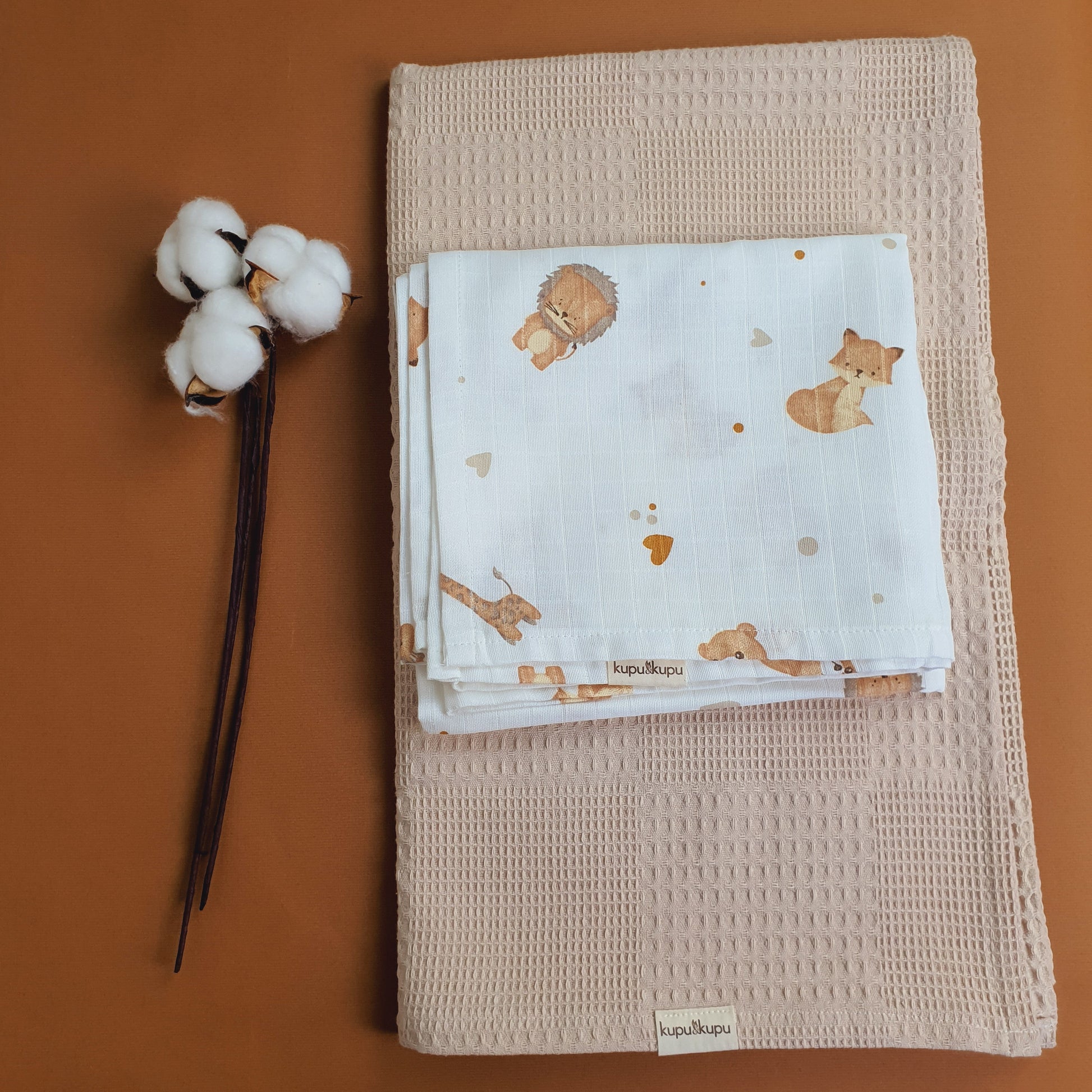 🧵 Farklı Dokular, Tek Set: Waffle dokulu pamuklu pike ile sıcak tutan, nefes alan bir örtü – müslin örtü ile hafif ve yumuşacık bir alternatif.
