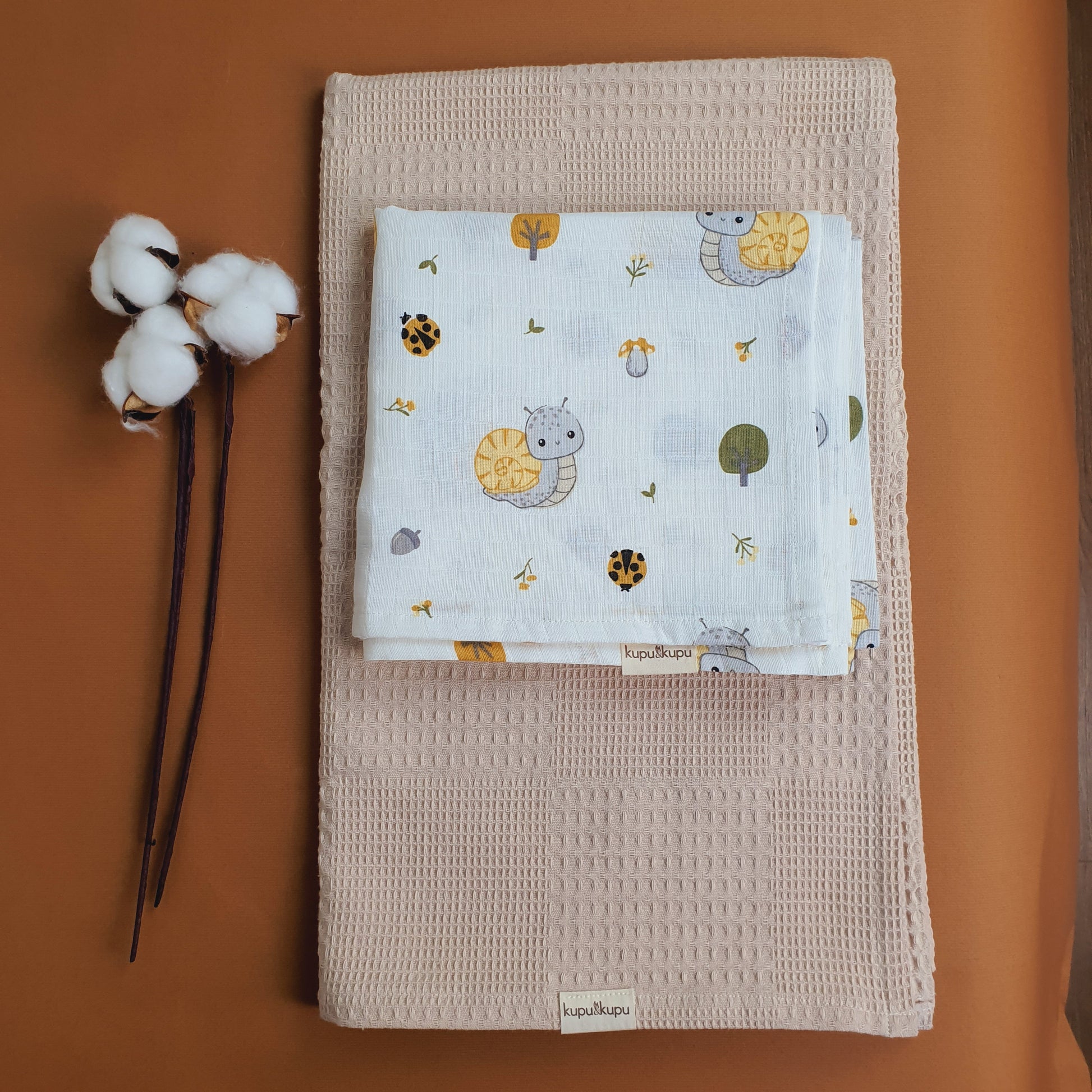 Biri 115x95 cm ölçülerinde pamuklu waffle pike, diğeri 95x85 cm sevimli salyangoz baskılı müslin örtü… Bu özenle hazırlanmış ikili set, hem görsel hem de işlevsel olarak annelerin favorisi olmaya aday.